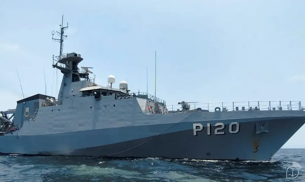 Navio da Marinha do Brasil, com destaque para a embarcação P120 em águas abertas.